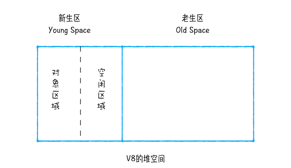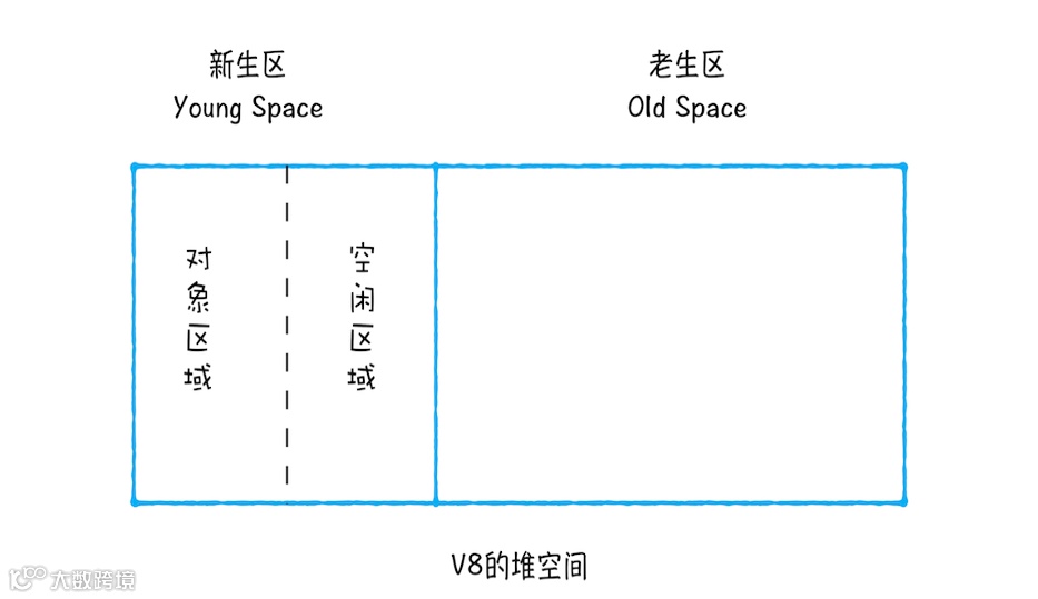 基于此,V8 将堆内存分为新生代和老生代两个区域。新生代存放生命周期短的对象,老生代存放生命周期长的对象。V8 的垃圾回收器分为主垃圾回收器和副垃圾回收器。