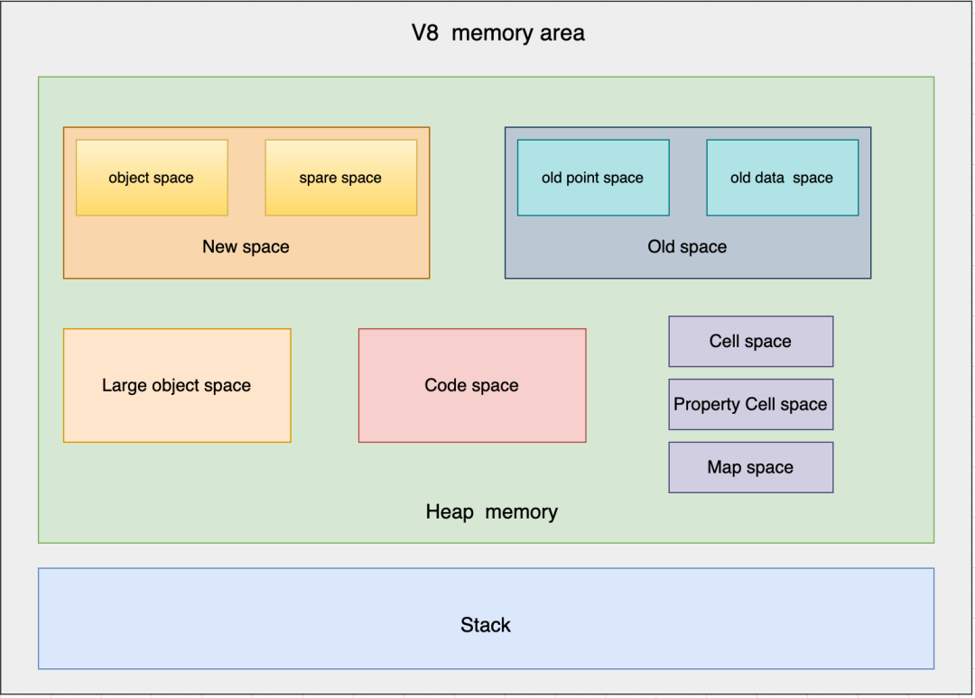 堆内存是 V8 中用于动态分配内存的区域,存储 JavaScript 对象、闭包、函数等数据。堆内存进一步分为以下几个区域: -