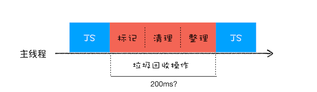 如果在执行垃圾回收的过程中,占用主线程时间过久,就像上面图片展示的那样,花费了 200 毫秒,在这 200 毫秒内,主线程是不能做其他事情的。比如页面正在执行一个 JavaScript 动画,因为垃圾回收器在工作,就会导致这个动画在这 200 毫秒内无法执行的,这将会造成页面的卡顿现象。