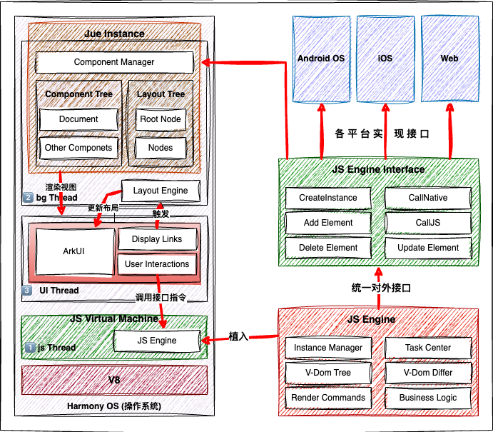 App启动时第一时间就会加载动态化 SDK,包括 JS Engine(动态化自主研发的为各平台的 JS 虚拟机扩展的功能) 和 Jue Instance (鸿蒙端对 JS Engine Interface 的实现)两部分,完成动态化运行环境的初始化。具体包括业务代码实例管理、任务管理、虚拟Dom树管理、虚拟Dom树 Differ、业务页面渲染管理、生命周期管理、事件分发、业务逻辑处理等一系列功能。