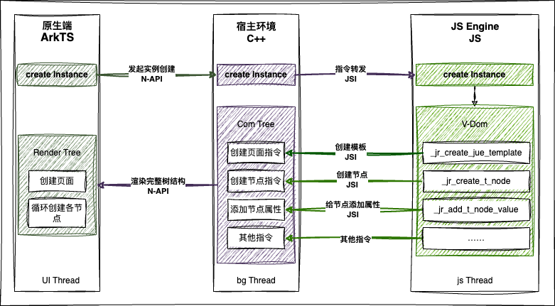 上图展示了动态化在鸿蒙端绘制页面的过程,总结一下就是三种语言环境,三个 Instance,三个 Thread 。三个 Instance 独立且一一对应。ArkTs 中的 Instance 在 UI 线程中用来完成页面的绘制,数据的绑定和事件的触发等。C++ 中的 Instance 作为数据的中转存储和事件转发,在 bg Thread 处理复杂耗时的逻辑,避免阻塞 UI Thread 和 js Thread。JS 中的 Instance 负责搜集产物信息,构建 V-Dom Tree,传递数据和事件等都在 js Thread 中处理。C++ 和 ArkTs 中根据 V-Dom Tree 创建 Component Tree 和 Render Tree。