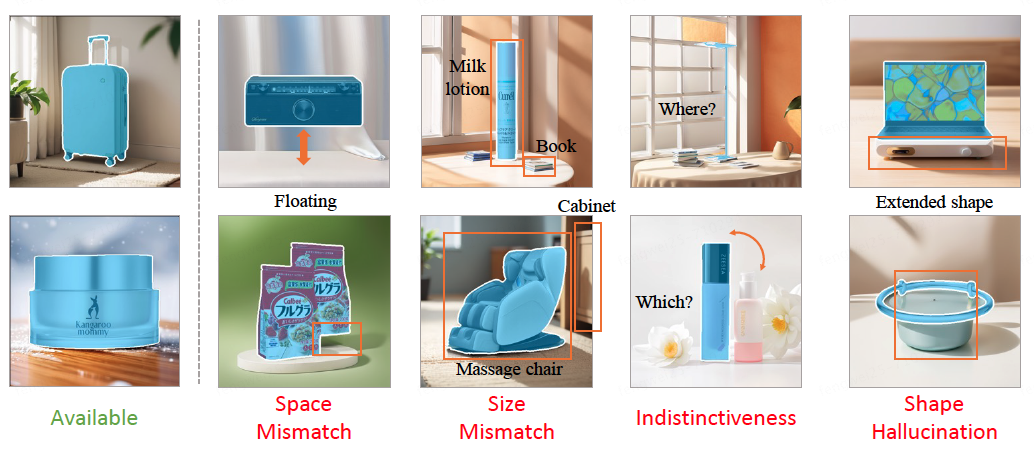 尽管最近AIGC技术蓬勃发展,使得创意制作摆脱了成本和效率的限制。然而,大模型在广告创意的应用上还存在诸多问题。如下方图片所示,现有的图片生成模型会产出空间失调/大小失调/商品不显著和形状幻觉等bad case: