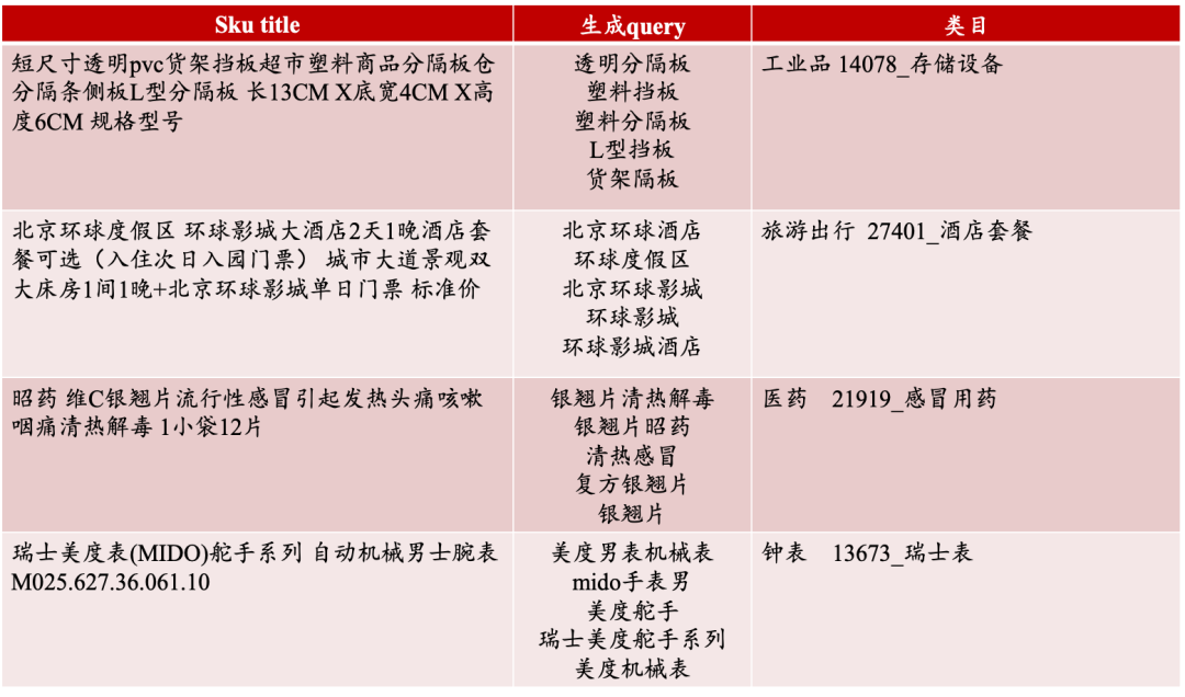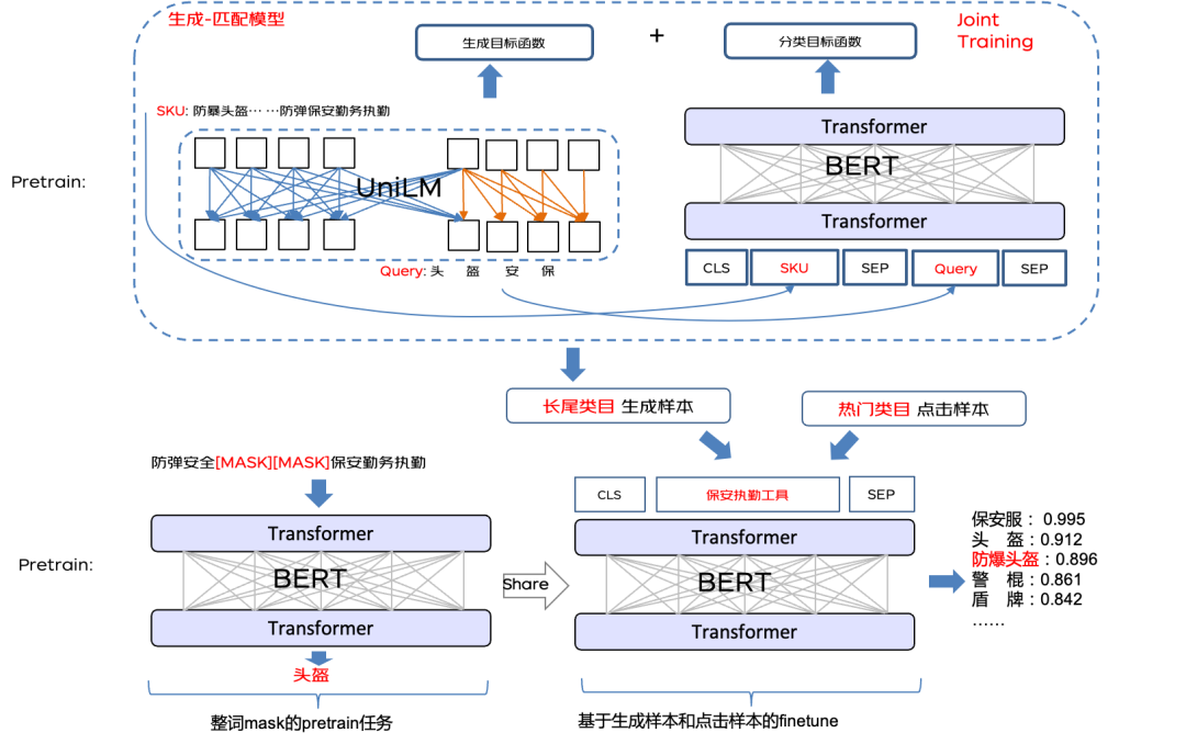 解决方案:针对训练样本的类目高度不平衡问题,我们设计了生成-匹配模型,预训练一个query生成模型+query-SKU匹配模型,生成模型用来根据SKU的标题/属性信息生成query,匹配模型用于计算生成query和原SKU title的相关性分数,卡掉低质量的query,保证生成query的质量。Sku的类目作为生成query的类目,补充到类目预测的训练样本中,平衡和缓解训练集类目失衡问题,让模型能够学习到用户query中的长尾类目需求,从而让长尾类目商品有一定的曝光机会。