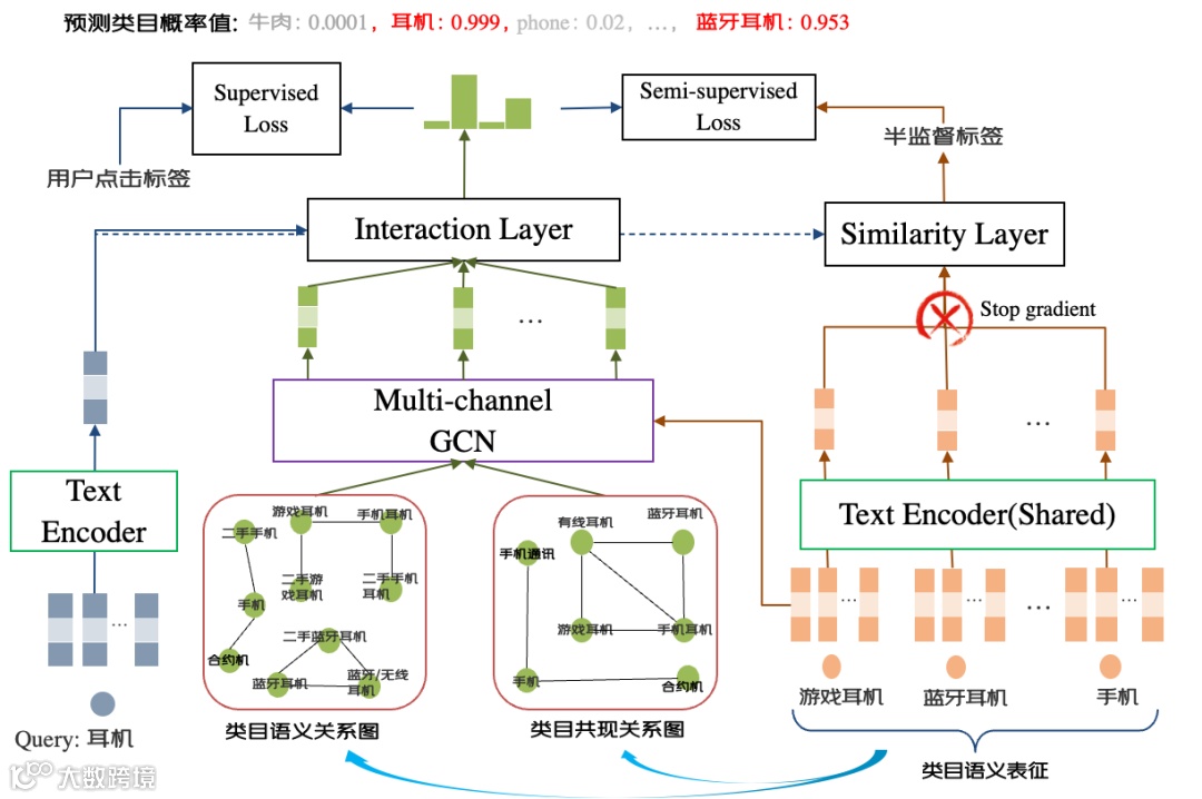 解决方案:通过引入先验知识和模型的优化,增强模型对电商知识的感知,弱化模型对后验反馈的依赖:引入先验知识:类目语义知识、类目共现/语义关系图。通过提取类目名、类目的产品词等,代表类目侧的语义表征。通过类目关系图,反映类目共点击和语义相似关系,实现头部类目带长尾(相关)类目来提升召回率。学习先验知识:设计新模型,以BERT为文本编码器,学习Query和类目表征。以多通道GCN为图结构编码器,学习类目之间的关系。设计半监督Loss,通过query-类目语义匹配分数,作为监督信号增强类目标签。