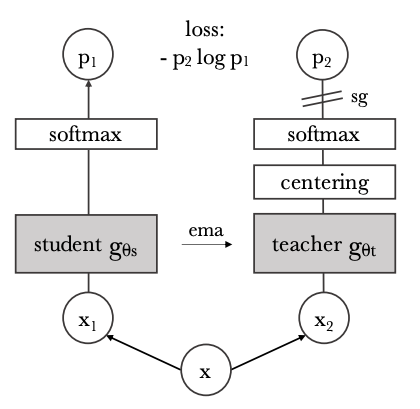 基于图像模态的商品表征 目前商详主图中存在一定的噪声,因此对于全图的表征往往会受到噪声的干扰,之前的做法往往先对主商品进行抠图,之后再进行特征提取,但是这种两阶段的特征提取依赖主图区域的准确标注,并会带来误差累积的问题,不适合缺乏标签的电商图像预训练任务。我们考虑直接进行图像自监督方法(DINO)进行预训练,在模型训练的同时端到端提取可靠的图像主体表征,具体流程如下图所示:
