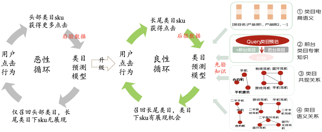 模型的训练依赖query点击商品的类目来作为监督信号。像这些偏冷启动类目的商品,我们希望通过增加商品曝光来让它们获得更多点击。有了点击数据,就能正向影响下次模型迭代,让模型下一次可以预测的更准。从而让整个模型迭代的流程形成良性循环,而不是马太效应的恶性循环。