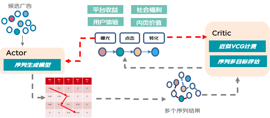 首先面临要解决的是700选4的排列组合问题,序列的搜索空间上千亿,我们将此定义成一个强化学习的问题,借鉴了经典的Actor-Critic架构,Actor输出概率矩阵,通过采样的手段去求解排列组合问题,同时我们利用用户的真实反馈去提升Critic的评估水平,挑选出的最优组合会利用策略梯度的方式指引Actor学习。通过这种互相迭代自提升的方式去高效逼近最优组合。