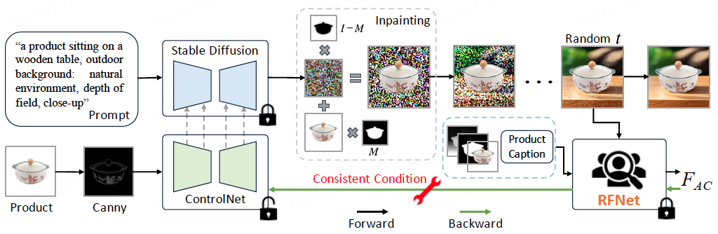 为了解决上述问题,我们提出一种多模态可靠反馈网络(RFNet),用于自动审核生成的图片,并将其应用于递归生成过程中,从而提高可用广告图片的数量。此外,我们通过一致性条件正则化(Consistent Condition regularization)微调扩散模型,利用RFNet的反馈,显著提升了生成图片的可用率,减少了递归生成的尝试次数,同时保持了高效的生产过程和视觉吸引力。我们还构建了一个包含超过一百万张人工标注生成广告图片的RF1M数据集,帮助训练RFNet准确评估图片的可用性。这项工作发表在计算机视觉顶级会议ECCV2024。