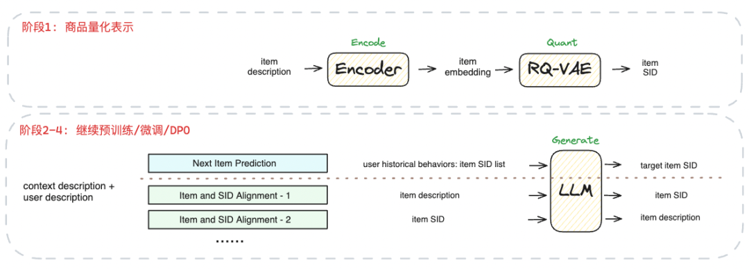 生成式推荐涉及两个接地(grounding)过程,“将语言空间接地到推荐空间”和“将推荐空间接地到实际商品空间”。为了实现这两个过程,我们的方案如下: