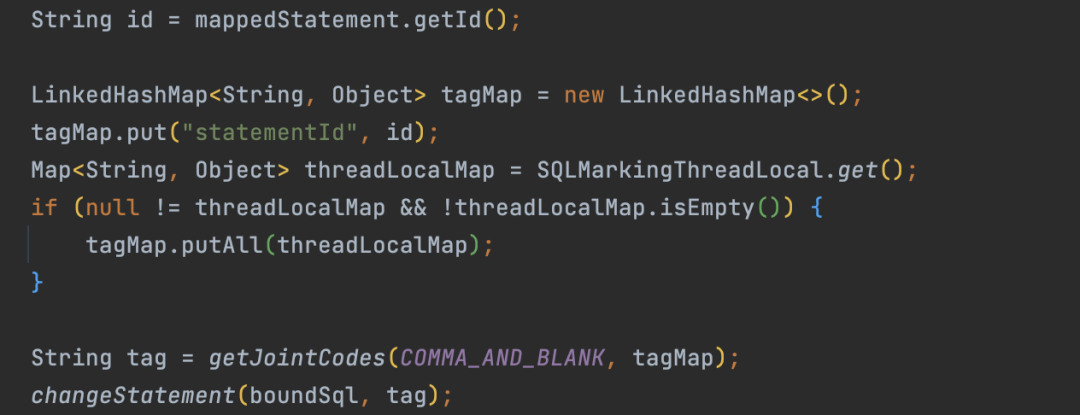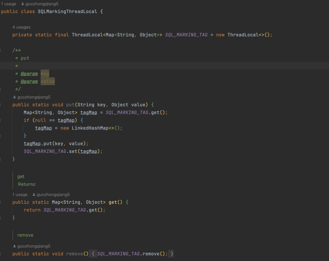 // 其他代码SQLMarkingThreadLocal.put("operator", UserInfoUtil.getUserCode());// 其他代码SQLMarkingThreadLocal.remove();// 其他代码