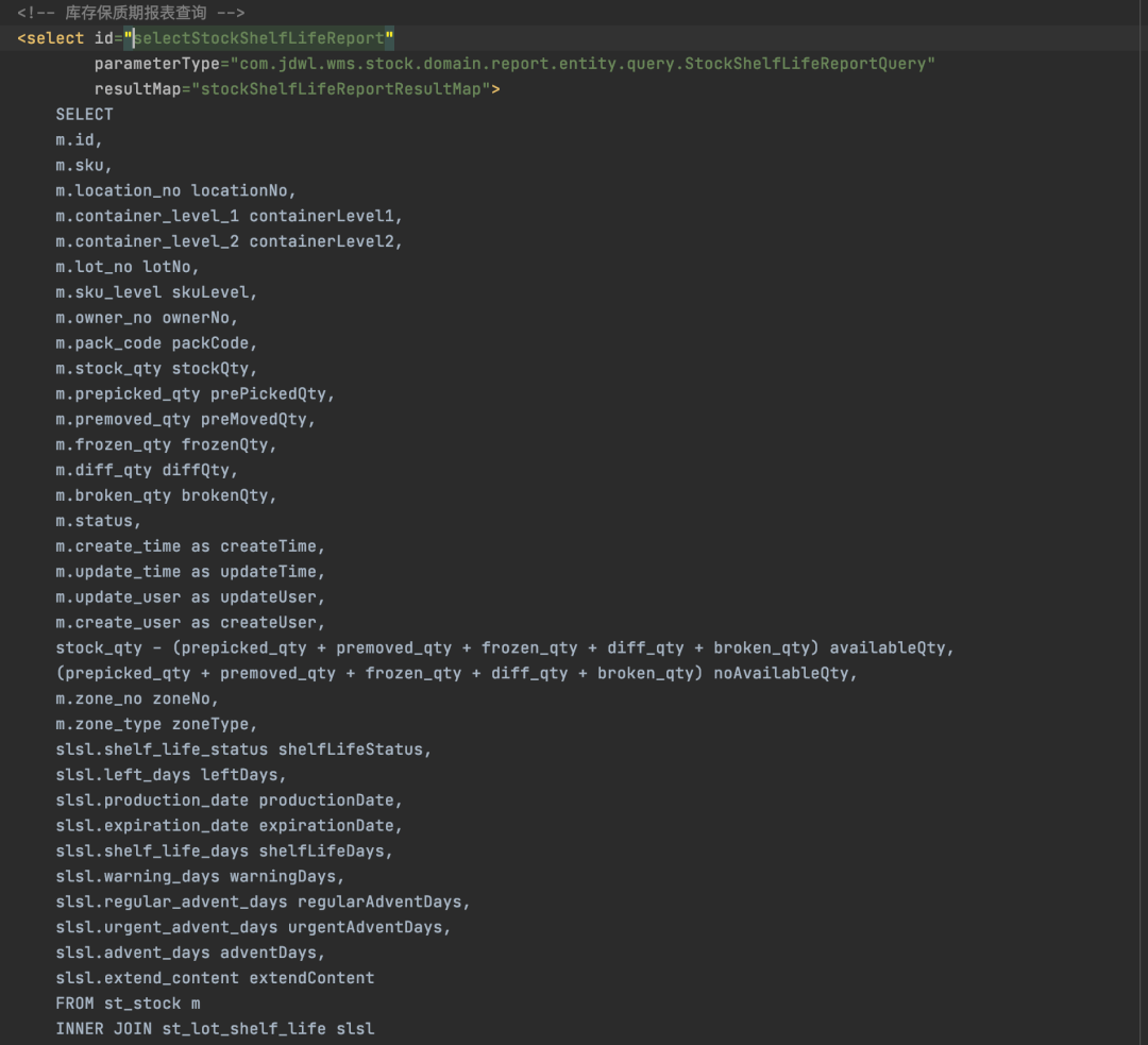 SELECTm.id,m.sku,m.location_no locationNo,m.container_level_1 containerLevel1,m.container_level_2 containerLevel2,m.lot_no lotNo,m.sku_level skuLevel,m.owner_no ownerNo,m.pack_code packCode,m.stock_qty stockQty,m.prepicked_qty prePickedQty,m.premoved_qty preMovedQty,m.frozen_qty frozenQty,m.diff_qty diffQty,m.broken_qty brokenQty,m.status,m.create_time AS createTime,m.update_time AS updateTime,m.update_user AS updateUser,m.create_user AS createUser,stock_qty -(prepicked_qty + premoved_qty + frozen_qty + diff_qty + broken_qty) availableQty,(prepicked_qty + premoved_qty + frozen_qty + diff_qty + broken_qty) noAvailableQty,m.zone_no zoneNo,m.zone_type zoneType,slsl.shelf_life_status shelfLifeStatus,slsl.left_days leftDays,slsl.production_date productionDate,slsl.expiration_date expirationDate,slsl.shelf_life_days shelfLifeDays,slsl.warning_days warningDays,slsl.regular_advent_days regularAdventDays,slsl.urgent_advent_days urgentAdventDays,slsl.advent_days adventDays,slsl.extend_content extendContentFROMst_stock mINNER JOIN st_lot_shelf_life slslONm.tenant_code = slsl.tenant_codeAND m.sku = slsl.skuAND m.lot_no = slsl.lot_noAND slsl.deleted = 0WHEREm.deleted = 0AND m.stock_qty > 0AND m.warehouse_no = ?AND m.lot_no != '-1' LIMIT ?/* [SQLMarking] statementId: com.jdwl.wms.stock.infrastructure.jdbc.report.dao.StockShelfLifeReportDao.selectStockShelfLifeReport, pFinderId: 4630283.56667.17392048399060130, operator: xxx, traceId: 59f48d4d-5346-4ffe-9837-693a090090fc */