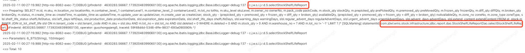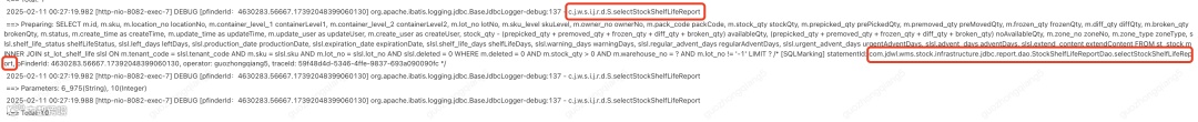 2025-02-11 00:27:19.982 [http-nio-8082-exec-7] DEBUG [pfinderId:4630283.56667.17392048399060130] org.apache.ibatis.logging.jdbc.BaseJdbcLogger-debug:137 - c.j.w.s.i.j.r.d.S.selectStockShelfLifeReport==> Preparing: SELECT m.id, m.sku, m.location_no locationNo, m.container_level_1 containerLevel1, m.container_level_2 containerLevel2, m.lot_no lotNo, m.sku_level skuLevel, m.owner_no ownerNo, m.pack_code packCode, m.stock_qty stockQty, m.prepicked_qty prePickedQty, m.premoved_qty preMovedQty, m.frozen_qty frozenQty, m.diff_qty diffQty, m.broken_qty brokenQty, m.status, m.create_time as createTime, m.update_time as updateTime, m.update_user as updateUser, m.create_user as createUser, stock_qty - (prepicked_qty + premoved_qty + frozen_qty + diff_qty + broken_qty) availableQty, (prepicked_qty + premoved_qty + frozen_qty + diff_qty + broken_qty) noAvailableQty, m.zone_no zoneNo, m.zone_type zoneType, slsl.shelf_life_status shelfLifeStatus, slsl.left_days leftDays, slsl.production_date productionDate, slsl.expiration_date expirationDate, slsl.shelf_life_days shelfLifeDays, slsl.warning_days warningDays, slsl.regular_advent_days regularAdventDays, slsl.urgent_advent_days urgentAdventDays, slsl.advent_days adventDays, slsl.extend_content extendContent FROM st_stock m INNER JOIN st_lot_shelf_life slsl ON m.tenant_code = slsl.tenant_code AND m.sku = slsl.sku AND m.lot_no = slsl.lot_no AND slsl.deleted = 0 WHERE m.deleted = 0 AND m.stock_qty > 0 AND m.warehouse_no = ? AND m.lot_no != '-1' LIMIT ? /* [SQLMarking] statementId: com.jdwl.wms.stock.infrastructure.jdbc.report.dao.StockShelfLifeReportDao.selectStockShelfLifeReport, pFinderId: 4630283.56667.17392048399060130, operator: guozhongqiang5, traceId: 59f48d4d-5346-4ffe-9837-693a090090fc */2025-02-11 00:27:19.982 [http-nio-8082-exec-7] DEBUG [pfinderId:4630283.56667.17392048399060130] org.apache.ibatis.logging.jdbc.BaseJdbcLogger-debug:137 - c.j.w.s.i.j.r.d.S.selectStockShelfLifeReport==> Parameters: 6_975(String), 10(Integer)2025-02-11 00:27:19.988 [http-nio-8082-exec-7] DEBUG [pfinderId:4630283.56667.17392048399060130] org.apache.ibatis.logging.jdbc.BaseJdbcLogger-debug:137 - c.j.w.s.i.j.r.d.S.selectStockShelfLifeReport<== Total: 10