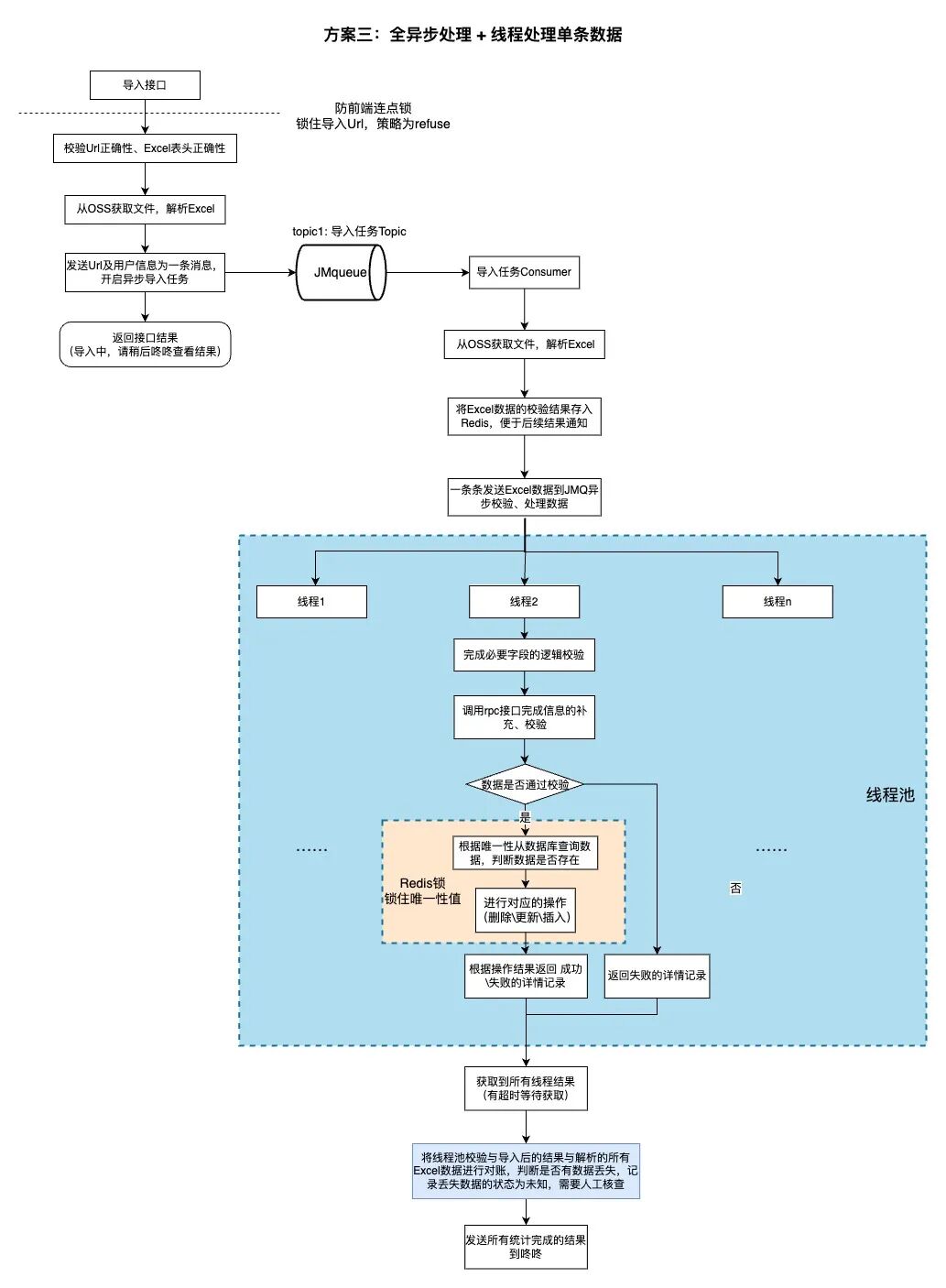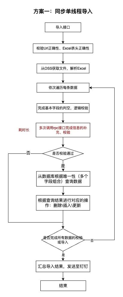 首先想到的方案为常用的同步导入,即在一台容器的一个线程中完成Excel中数据的解析、校验、导入、发送通知消息三部分流程。