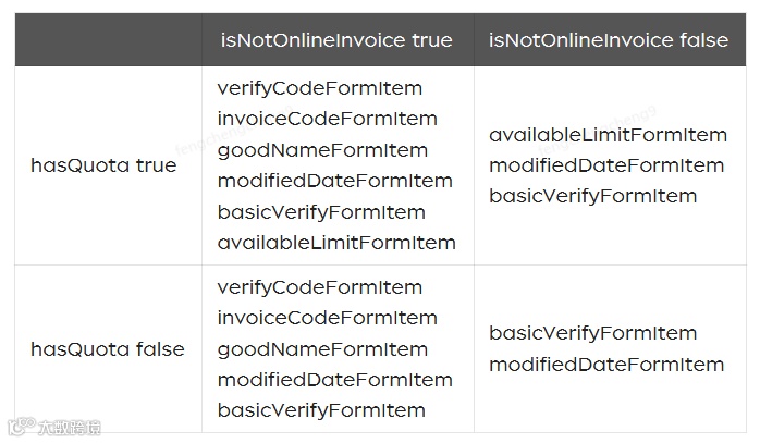 { hasQuota ? (['11', '12'].indexOf(invoiceType) === -1 ? (<div className="m-b-4 row"><div className="col-11"><FormItemlabel="基础核验">{basicVerifyStatus ? '已通过' : <div>未通过<Tooltip title={basicVerifyMsg} placement="bottom"><span className='iconfont icon-tishi theme-primary m-l-1 font-14' /></Tooltip></div>}</FormItem></div><div className="col-11"><FormItemlabel="剩余额度">{formatAmount(availableLimit)}</FormItem></div></div>) :<div className="m-b-4 row"><div className="col-11"><FormItemlabel="基础核验">{basicVerifyStatus ? '已通过' : <div>未通过<Tooltip title={basicVerifyMsg} placement="bottom"><span className='iconfont icon-tishi theme-primary m-l-1 font-14' /></Tooltip></div>}</FormItem></div></div>) :['11', '12'].indexOf(invoiceType) === -1 ? <div className="m-b-4 row"><div className="col-11"><FormItemlabel="基础核验">{basicVerifyStatus ? '已通过' : <div>未通过<Tooltip title={basicVerifyMsg} placement="bottom"><span className='iconfont icon-tishi theme-primary m-l-1 font-14' /></Tooltip></div>}</FormItem></div></div> :null}