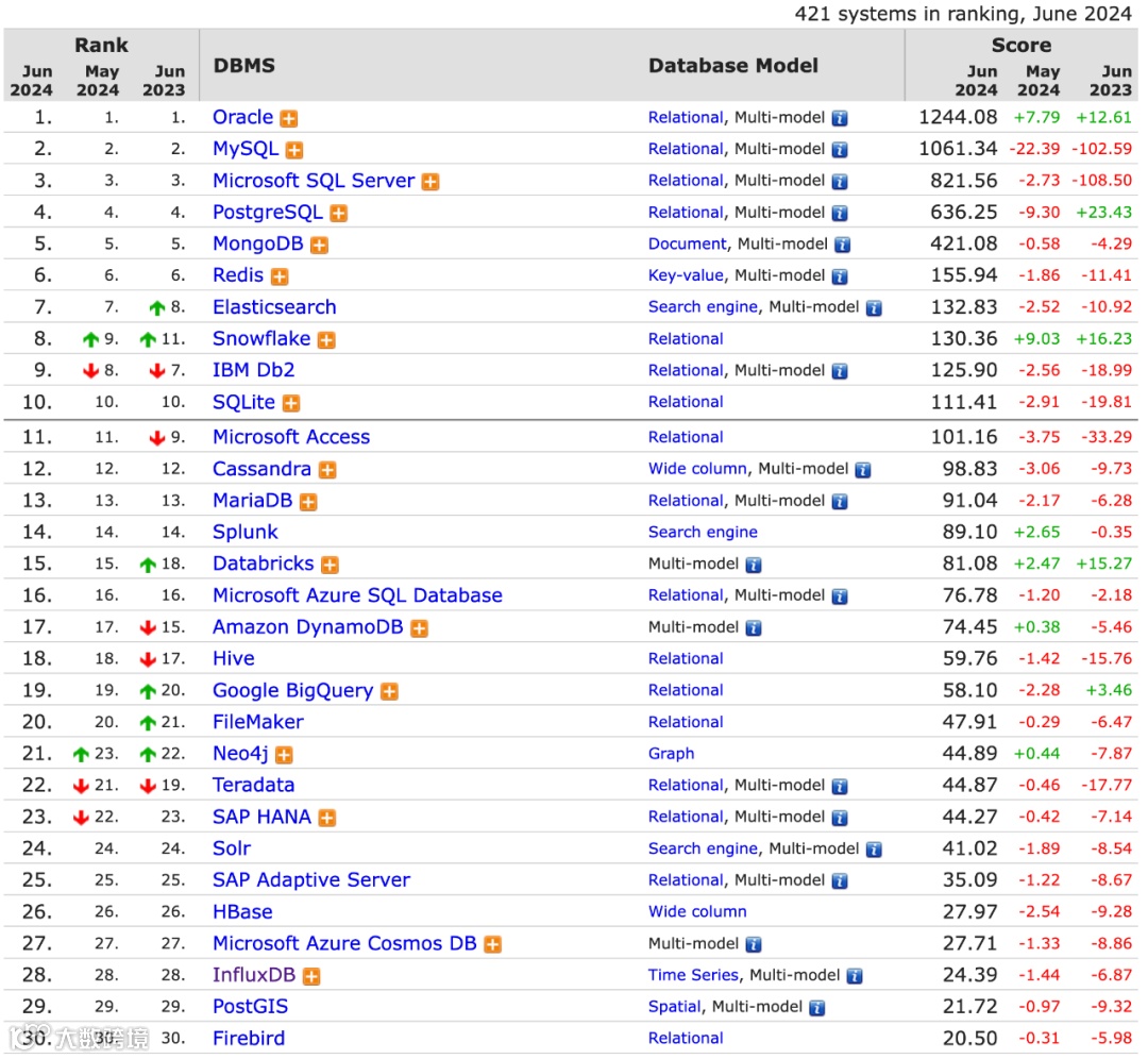 以下是2024年6月份的DB-Engines(https://db-engines.com/en/ranking)数据库排名列表,这是一个专门收集和呈现数据库管理系统信息的数据库引擎排名,里面列举了超过 300 多种数据库产品,大部分的开源和商业数据库都在列,排名中的位置通常能反映出它的使用情况。