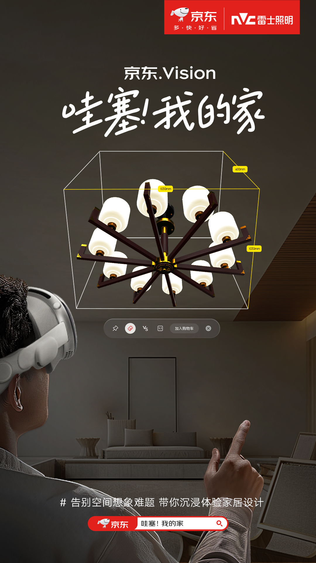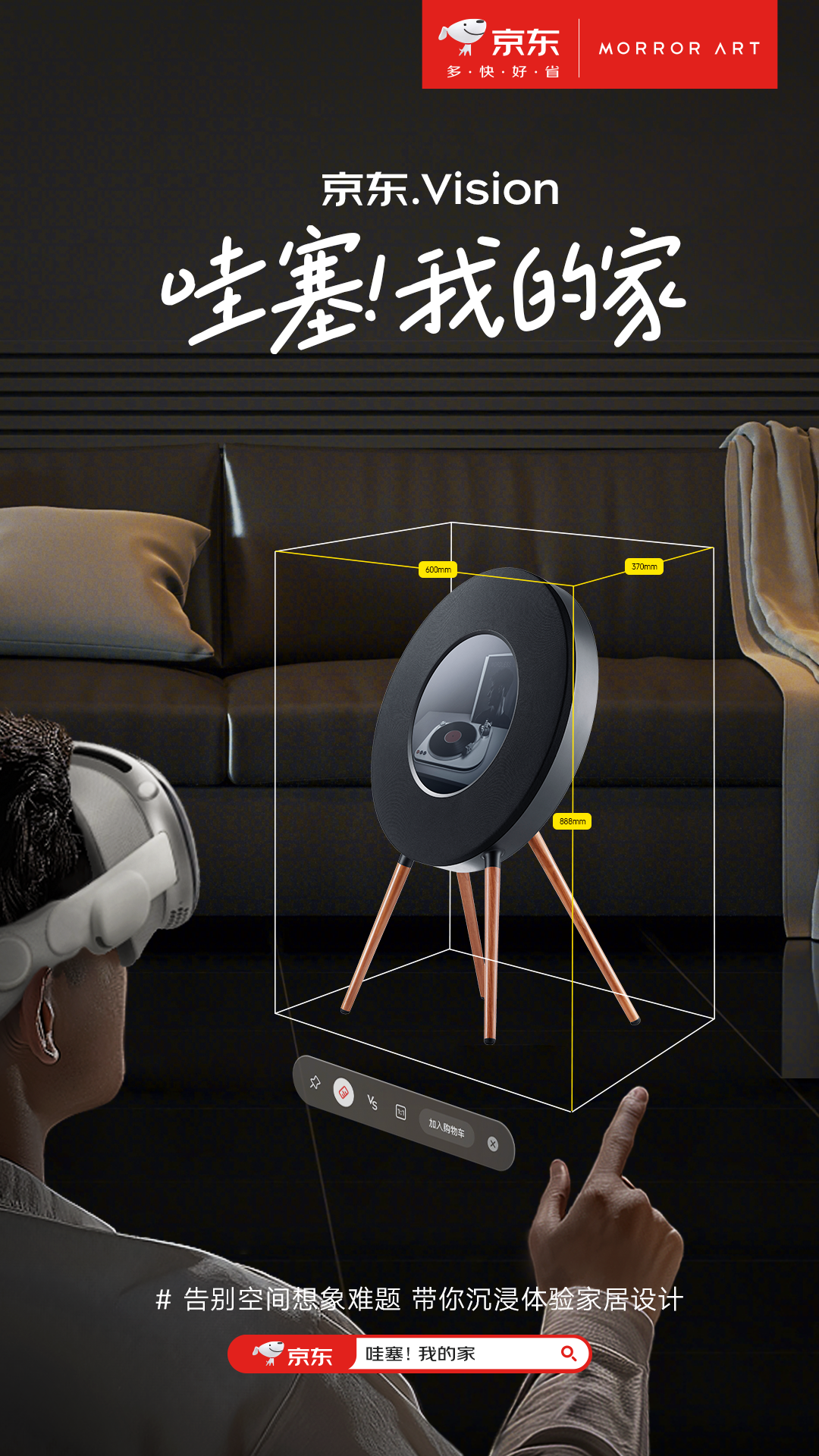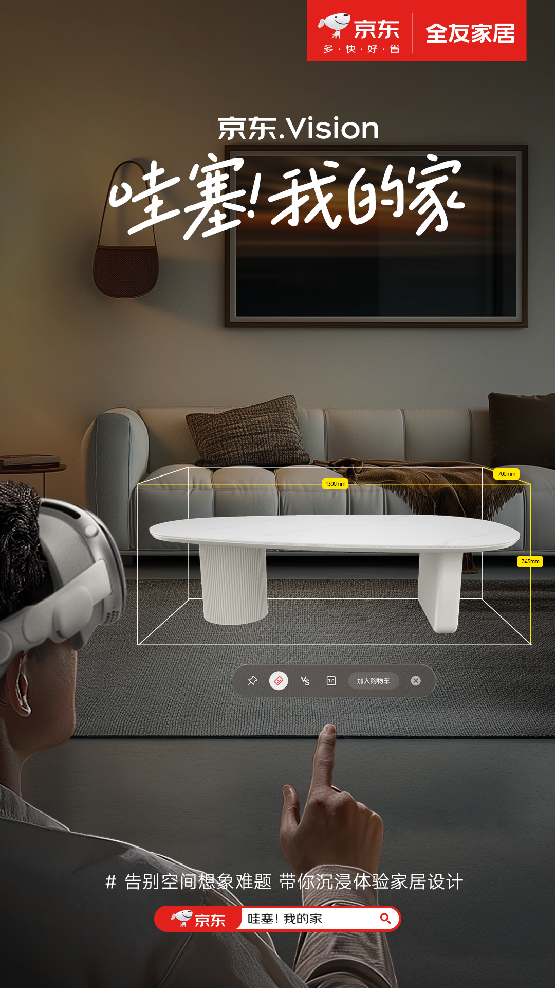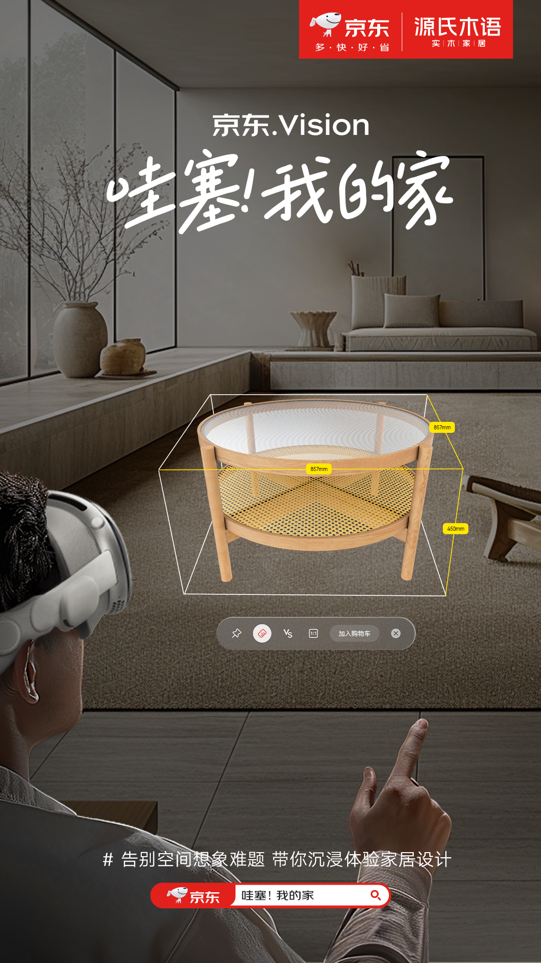 所以,京东.Vision利用Vision Pro的空间计算技术,为大家提供了一种全新的购物方式。在这里,你可以将心仪的产品1:1等比例“拖拽”到家中,直接看到每件物品的在空间中的布局和外观,真正享受“所见即所得”的购物体验。