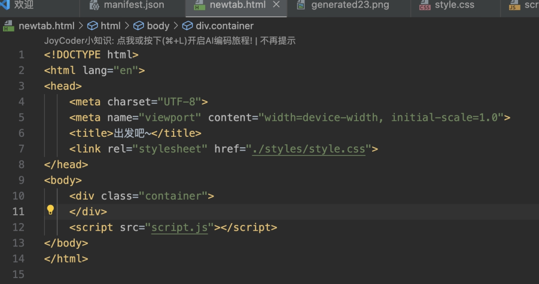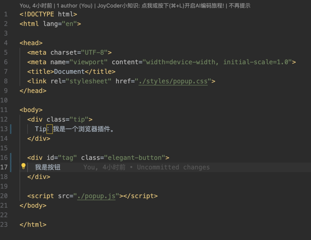 和写html页面一样,在body里面写元素,但是需要注意样式文件popup.css和脚本文件popup.js需要外部引入。