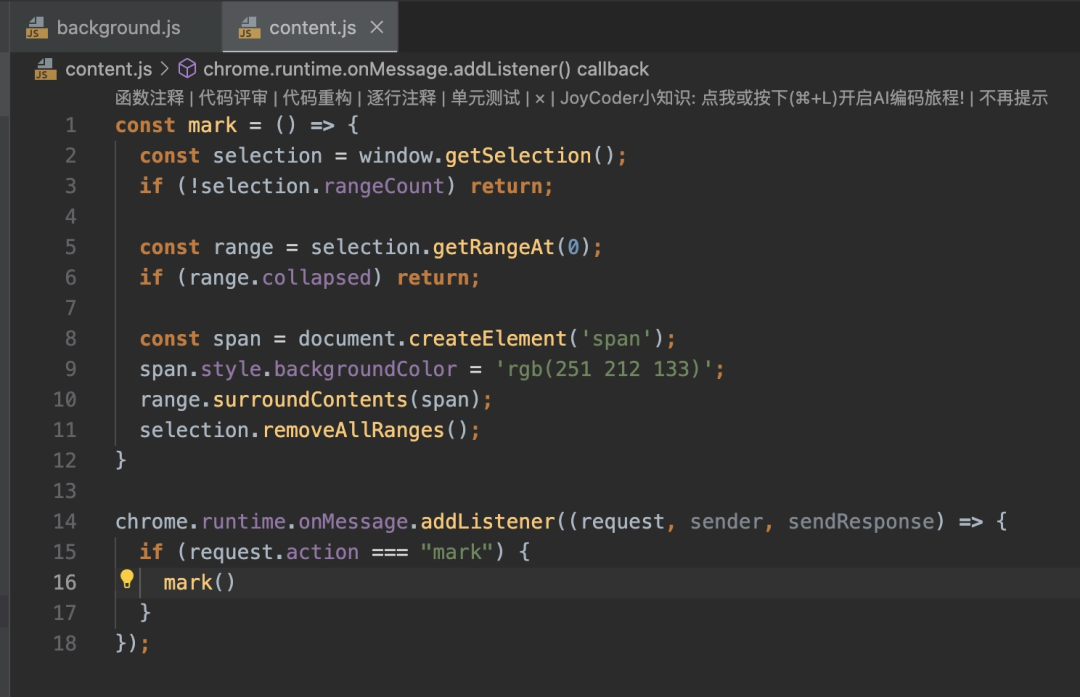 content.js会被插入到网页环境中,用于监听浏览器事件,读取和操作DOM元素。