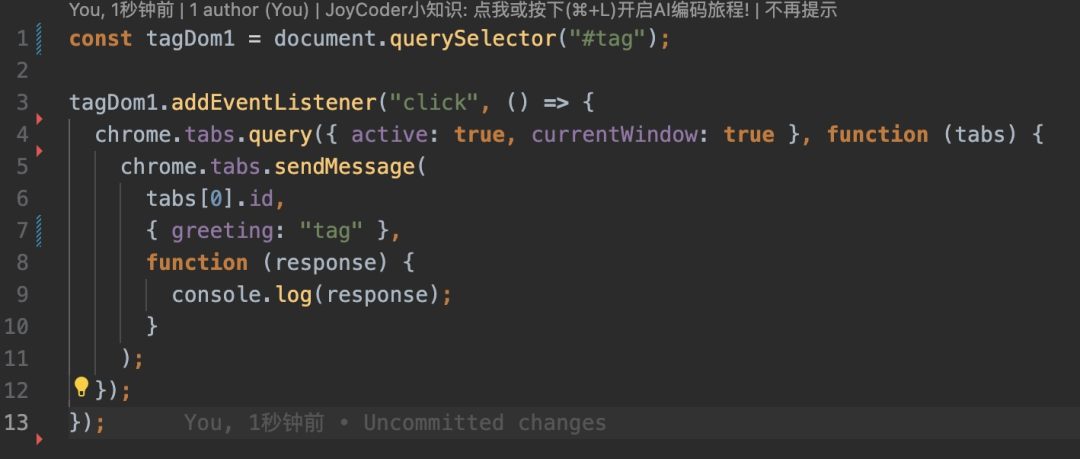 以下代码是在popup.js中,监听id为tag元素的点击事件,获取当前窗口active标签页,并给此标签页推送一个message。