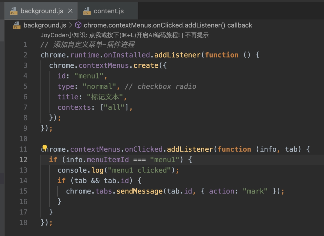| background.js | 后台文件,可以监听浏览器事件,在浏览器后台持续运行。 |