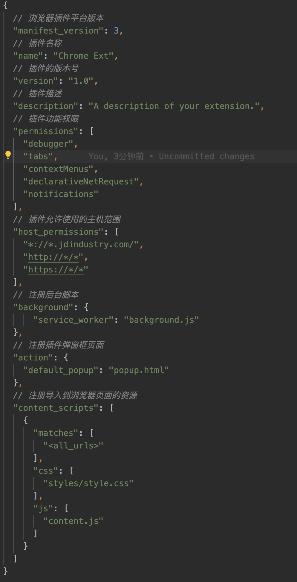 | manifest | 核心配置文件,配置插件平台版本、名称、权限、Aicon、Api权限、host权限等。 |