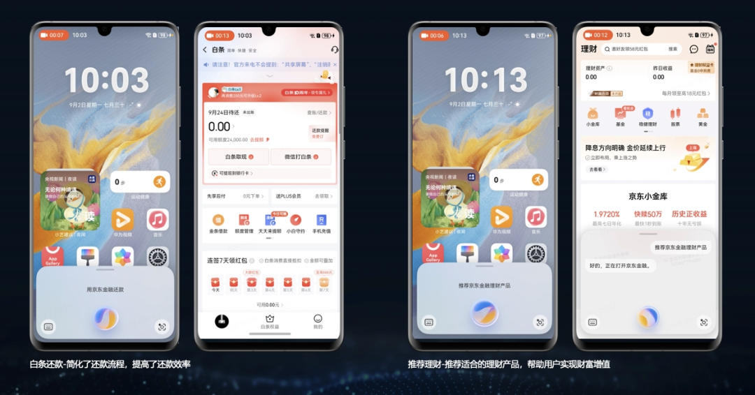 京东金融团队早在2023年11月份就已经开始对HarmonyOS NEXT系统进行调研,并与华为达成合作意向,合作启动了"京东金融鸿蒙项目",并于6月份首次上架了尝鲜版。经过三个季度的攻坚,京东金融于9月19日上线6.9.30正式版本,该版本基于鸿蒙原生能力开发,并使用了系统级AI能力及意图框架,可实现对用户显性与高阶意图的理解,并通过小艺对话、智慧搜索等全场景智慧入口, 在不同终端或者场景中更精准地满足用户的个性化需求。