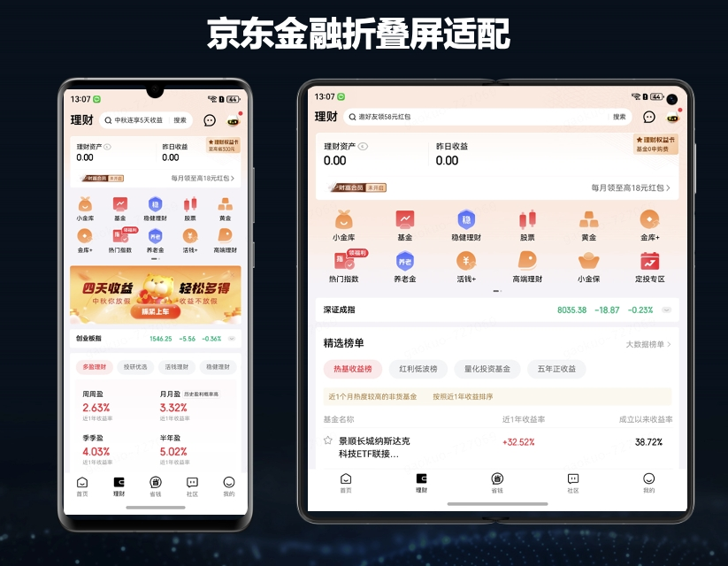 根据华为的要求,所有应用都需要对折叠屏手机进行适配。如果不对折叠屏进行适配则无法上架应用商店,为保证京东金融顺利通过应用市场的审核,参考华为提供的折叠屏适配方案,综合风险、成本等因素考虑,最终使用所有控件整体放大1.2倍的思路进行适配,并通过华为一多测试,满足上架要求。