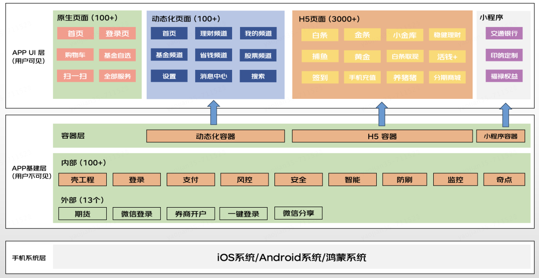 在"京东金融鸿蒙项目"进入研发阶段前,团队首先对App进行了整体架构梳理,App侧以功能为维度进行层级划分主要分为基建层和业务层 (只有全面理解整体架构才能为后续的方案选择奠定坚实基础)。