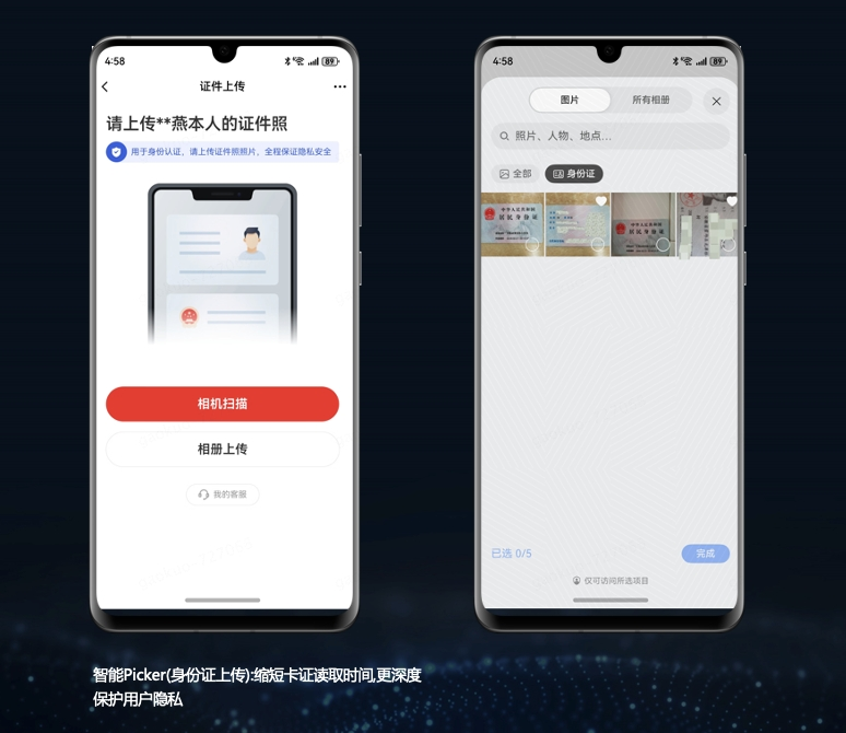智能PhotoPicker是基于PhotoPicker的高阶功能,该功能可以从大量图片中根据配置的智能推荐参数快速筛选出符合条件的图片,并在PhotoPicker中推荐给用户选择。目前支持的类型有如:身份证、银行卡、驾驶证、行驶证、二维码、头像等。