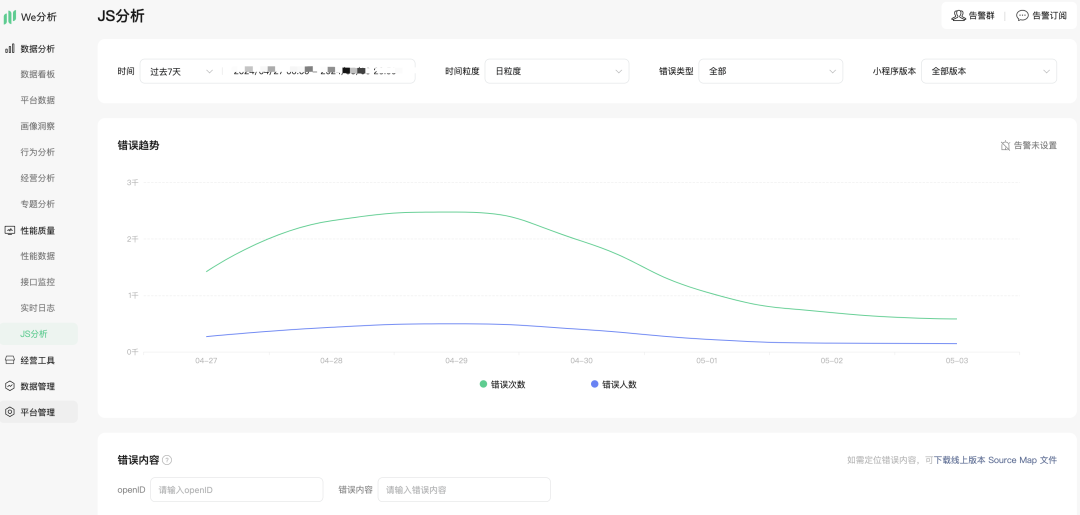 •通过配置 JavaScript 错误和资源错误的告警机制,我们在项目迭代过程中及时解决了多个 JavaScript 问题,有效降低了错误率和告警频率。正如前文所述,对于慧采PC 这类封闭环境,客户公司的网络策略可能会阻止埋点 SDK 和设备指纹等 JavaScript 资源的加载,导致全局变量获取时出现错误。我们通过实施异常捕获和队列机制,不仅规避了部分错误,还确保了埋点数据的准确上报。