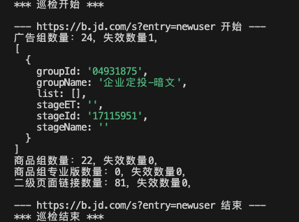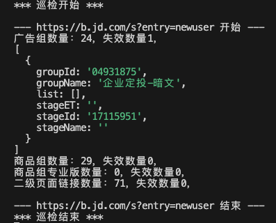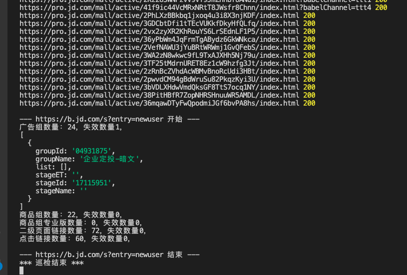自动化巡检工具能够检测页面上的多种元素和链接,包括 a 标签的外链、接口返回的链接、鼠标悬停元素、点击元素,以及跳转后 URL 的有效性。该工具尤其适合用于频道页,这些页面通常通过投放广告和配置通天塔链接来生成。在大型促销活动期间,我们可以运行脚本来验证广告和通天塔链接的有效性。目前,工具的功能还相对有限,并且对于广告组等特定接口的支持不够通用,这也是我们计划逐步改进和优化的方向。