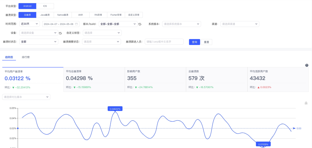 mPaaS:崩溃监控。应用崩溃对用户体验有显著影响,是移动端监控中的一个关键指标。通过不断地监控和优化,京东慧采移动端的崩溃率已经降至较低水平,目前的平均用户崩溃率大约为0.03%。