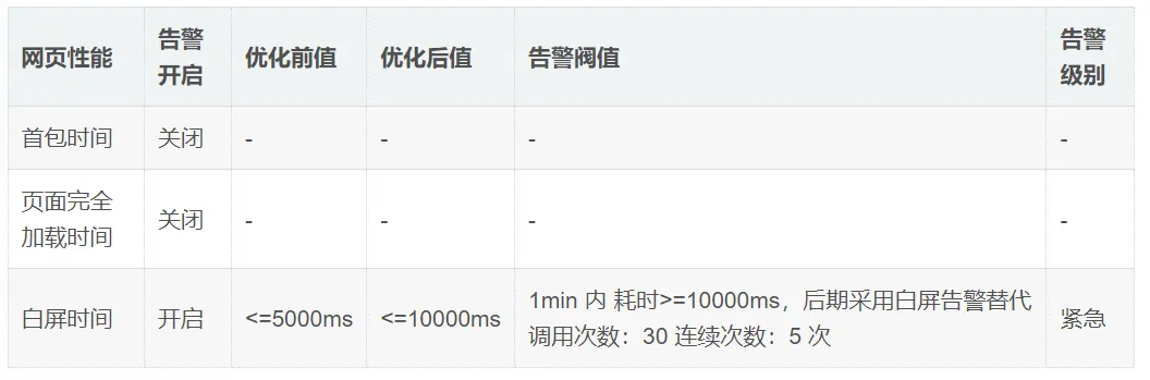 面对当前的局限性,我们采取了双策略应对。一方面,我们利用白屏告警功能直接监控页面的白屏情况;另一方面,我们通过分析页面加载性能指标中的白屏时间来间接监测潜在的白屏问题。在设置平均耗时时间和告警级别时,我们综合考虑了多个因素,包括用户的网络环境、告警的发生频率以及告警的实际适用性,以确保监控方案的有效性和合理性。
