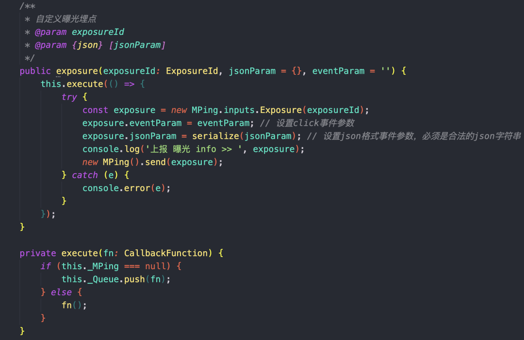 public exposure(exposureId: ExposureId, jsonParam = {}, eventParam = '') { this.execute(() => { try { const exposure = new MPing.inputs.Exposure(exposureId); exposure.eventParam = eventParam; exposure.jsonParam = serialize(jsonParam); console.log('上报 曝光 info >> ', exposure); new MPing().send(exposure); } catch (e) { console.error(e); } });}