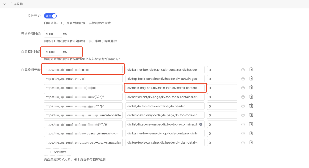 为了监控白屏时间,我们必须在应用的全局配置中的白屏监控项下,指定每个页面的 URL 及其关键元素。同时,我们还需设定监控的起始时间点和超时阈值。值得注意的是,URL 配置支持正则表达式,这为我们提供了灵活性,以匹配和监控一系列相似的页面路径。
