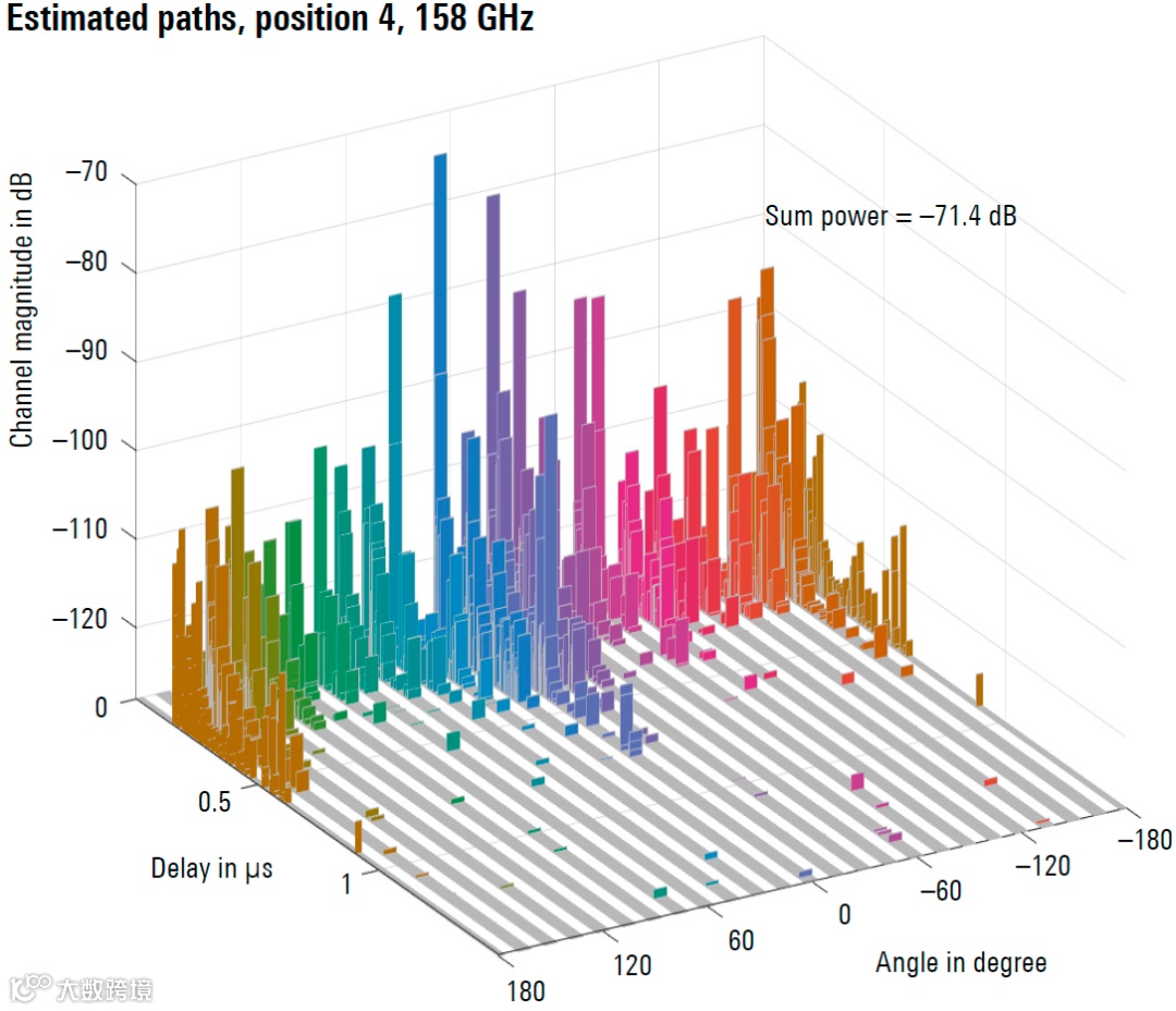 图33 显示了在同一测量点(室外 30米)对两个频率( 158GHz 和 300GHz )的路径评估结果。角轴表示循环维度,意味着这些图中的第一行和最后一行是相同的,这也反映在颜色上。针对这些评估,为了从噪音中清晰地区分信号路径,需要适当地控制噪声阈值。对于 图33 中给出的示例,将 158GHz 绝对噪声阈值被设置为 -120dB , 300GHz 时设置为 -118dB 。