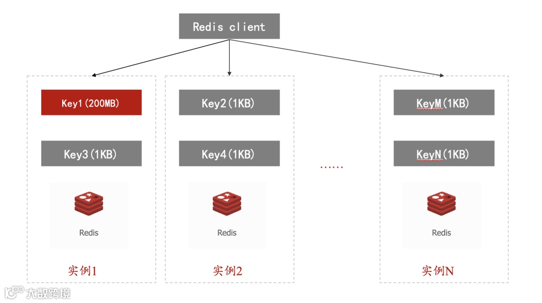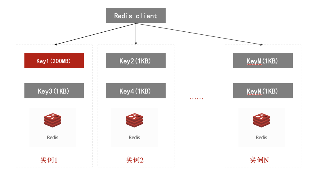数据量倾斜:某节点中key的大小高于其他节点中的Key,如下图,实例1中的Key1存储高于其他实例。