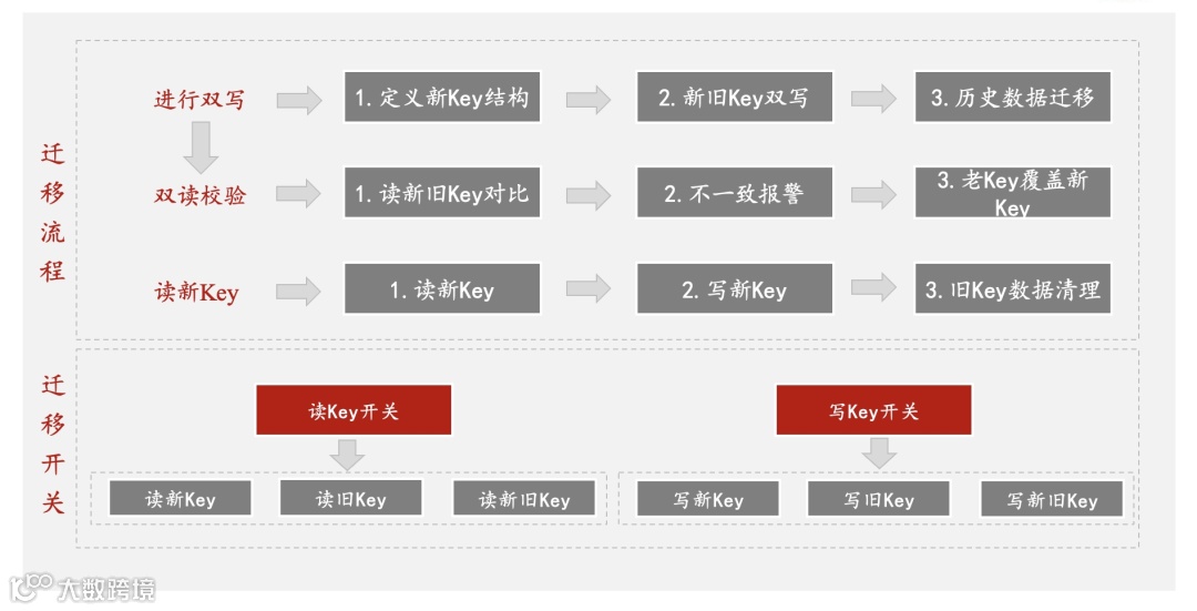 如果线上服务强依赖Redis,需要考虑到如何做到“无感”,并保证数据一致性。咱们基本上可以采用三步走策略,如下图所示。分别是进行双写,双读校验,最后读新Key。在此基础上可以设置开关,做到上线后的平稳迁移。