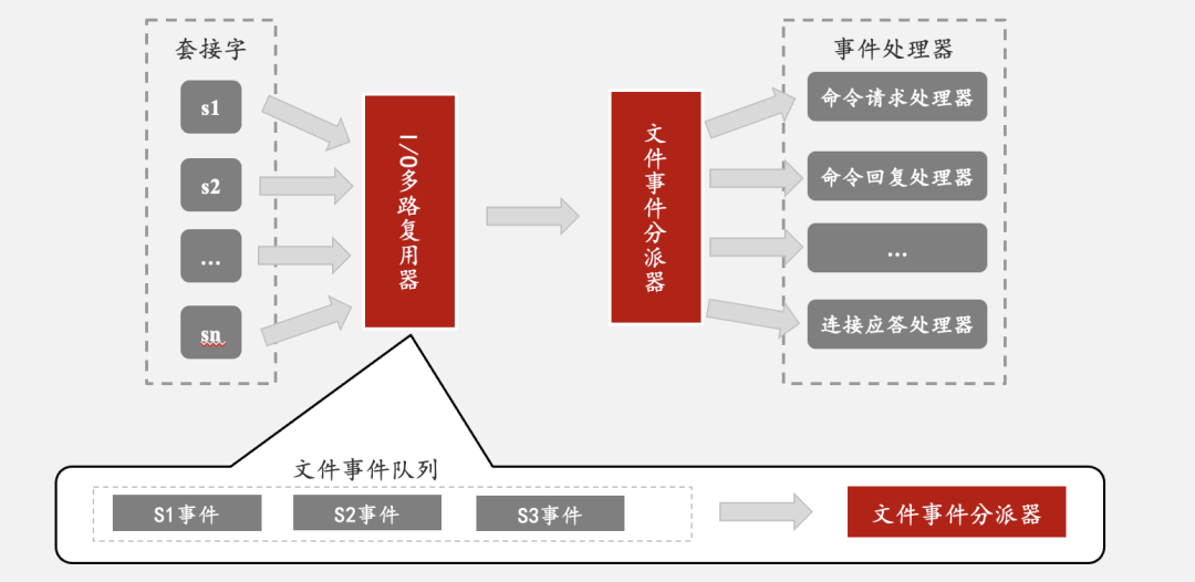 Redis基于Reactor模式开发了自己的网络事件处理器,即文件事件处理器,该处理器内部使用I/O多路复用程序,可同时监听多个套接字,并根据套接字执行的任务来关联不同的事件处理器。文件事件处理器以单线程的方式运行,但是通过I/O多路复用程序来监听多个套接字,既实现了高性能网络通信模型,又保持了内部单线程设计的简单性。文件事件处理器构成如下图: