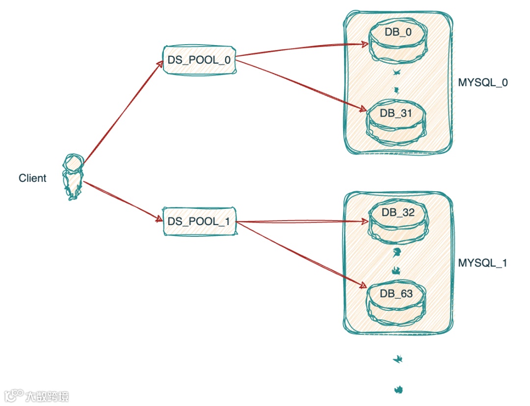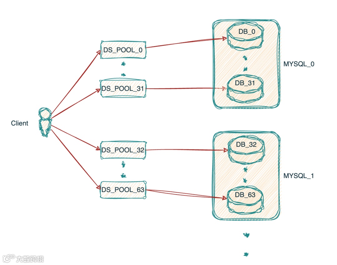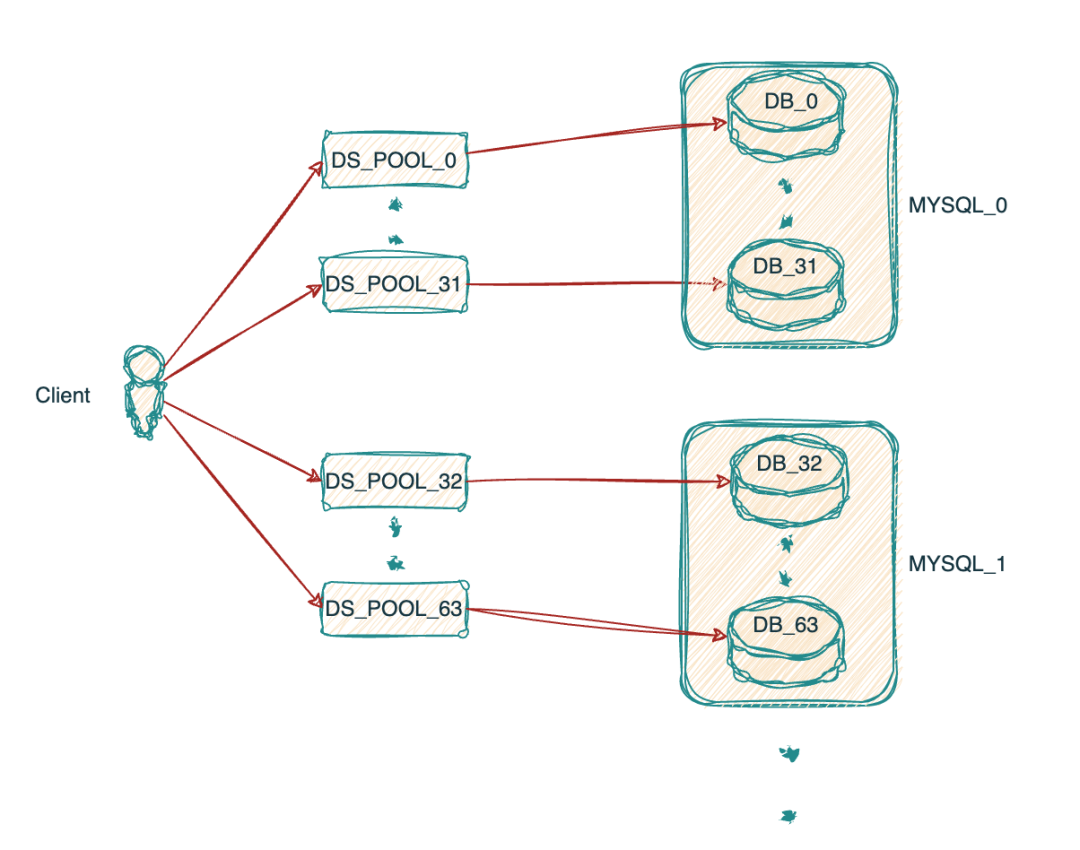 正如文章开头提到的目前我们的MYSQL集群架构如下,16个MYSQL实例,每个实例有32个库,集群共512个库.当客户端主机启动后与MYSQL_0实例中的32个库连接,分别会建立32个数据源,连接池配置的最大连接数为5,也就是说极端情况下一个客户端与一个MYSQL实例最多会建立32*5=160个连接数.对于物流的一些核心系统在大促时扩容上百台是很常见的,所以很快单个实例的最大连接数就会触达上限.