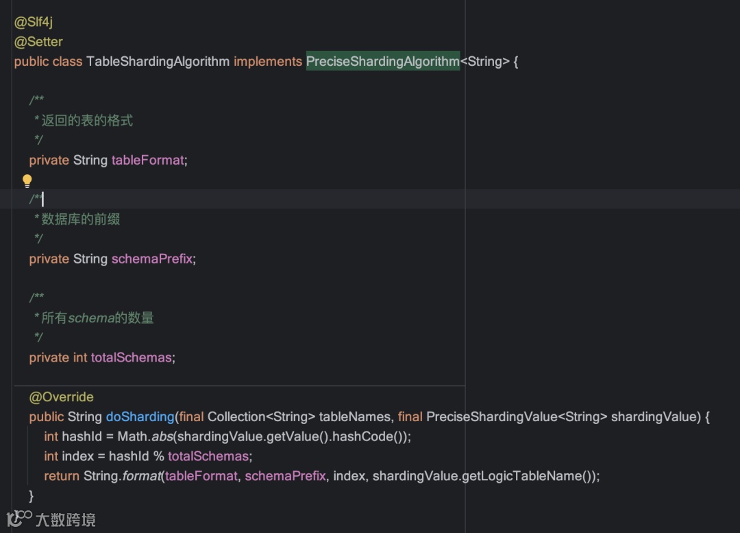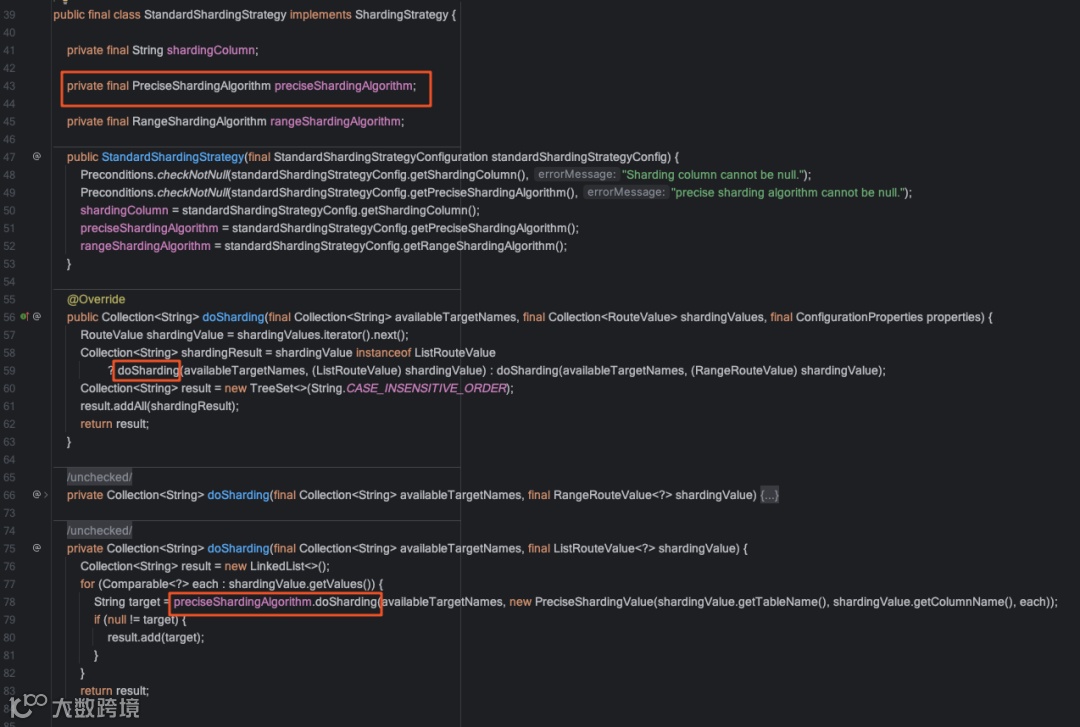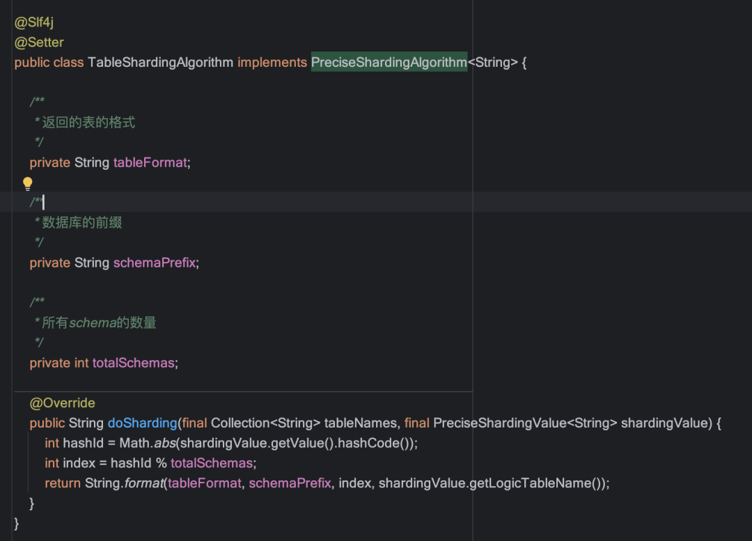 在StandardShardingStrategy类中有两个成员属性,preciseShardingAlgorithm(精准分片算法),rangeShardingAlgorithm(范围分片算法),由于我们的sql都只指定分片键精准查询,使用的都是preciseShardingAlgorithm计算出的结果,PreciseShardingAlgorithm是个接口,那我们就可以实现这个接口来自定义分片算法.