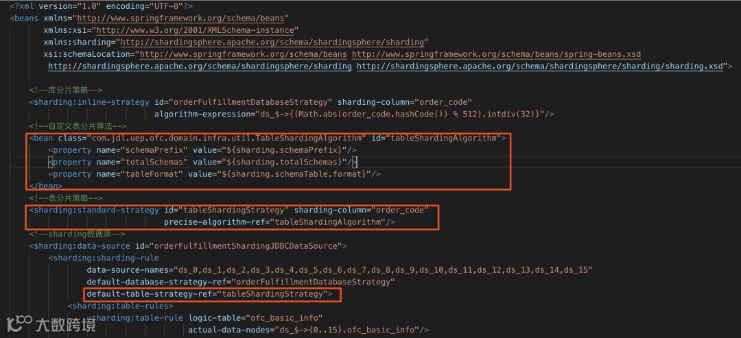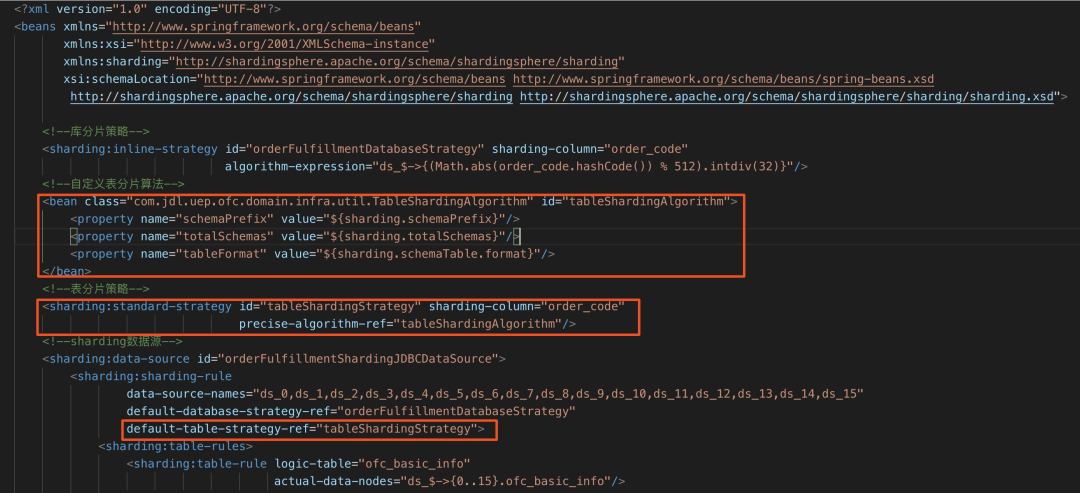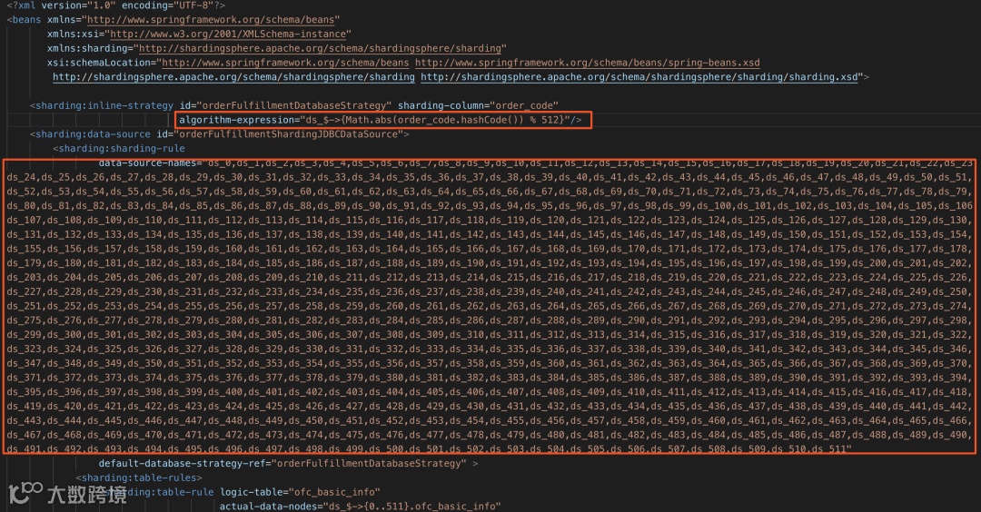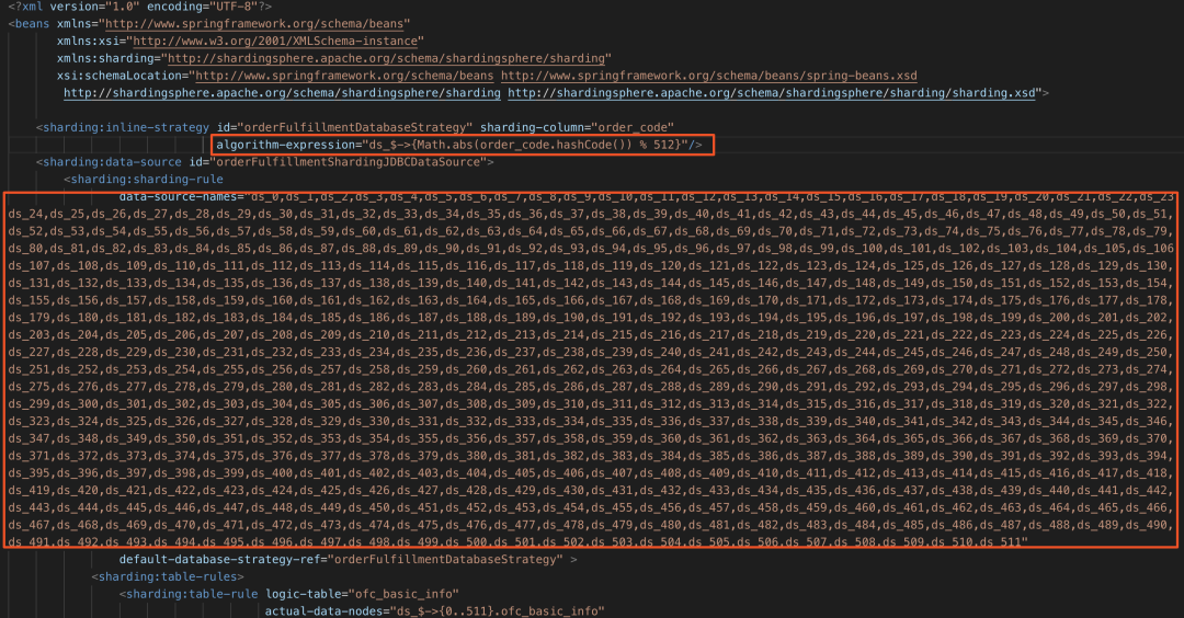 对于分片规则,我们可以依然使用<sharding:inline-strategy>标签,只需对Groovy表达式进行重写,分片键为order_code,之前分片算法为(Math.abs(order_code.hashCode()) % 512)即用order_code列的哈希值对512取模得到0~511,我们只需要将结果再整除32即可得到0~16,即表达式改写为(Math.abs(order_code.hashCode()) % 512).intdiv(32).