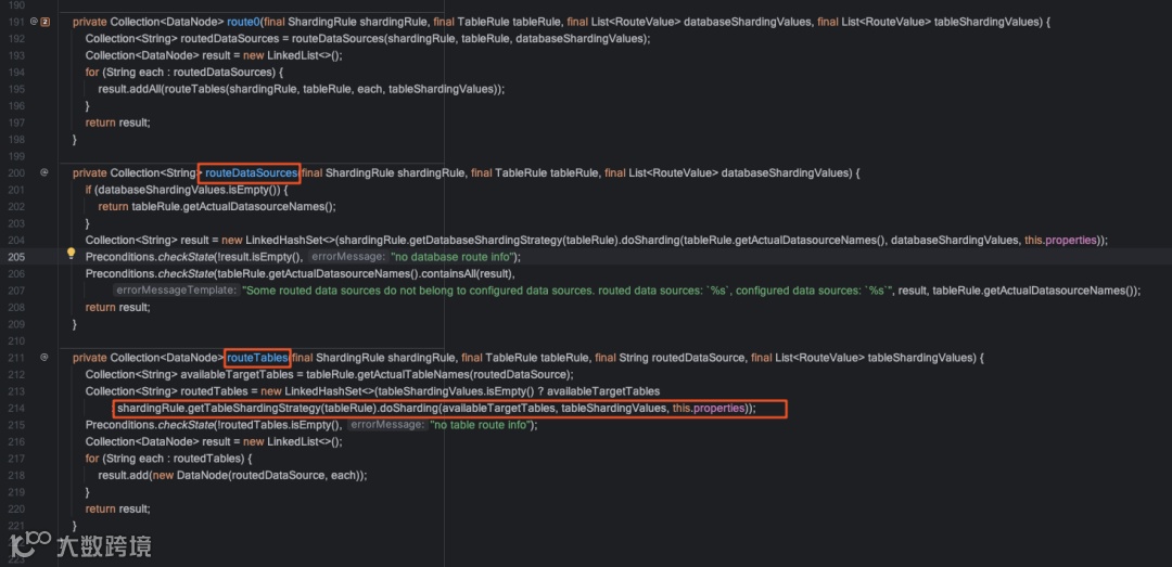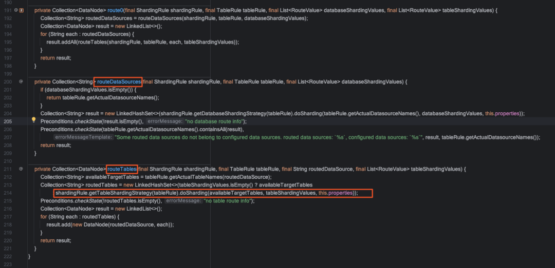 route方法中的核心逻辑在该类的route0方法中,其中routeDataSources方法负责database路由,routeTables方法负责table路由,实际路由计算在StandardShardingStrategy的doSharding方法中,我们继续深入.