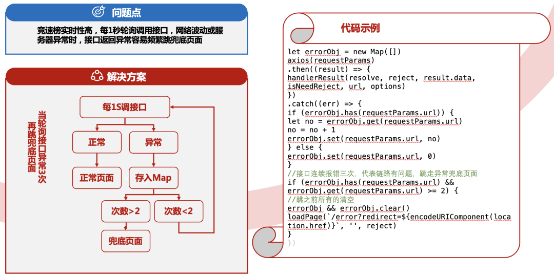 由于竞速榜要求实时性非常高,每秒都会轮询拿最新数据。为了避免因为网络波动或服务器异常等原因导致的偶发性错误,实行轮询接口3次调用出异常后才跳错误页面的做法。从而提高网站的稳定性和用户体验。如果只是偶发性的错误,那么用户在第一次或第二次尝试时可能会重新尝试,而不会立即放弃,从而减少了用户的流失率。同时,这种做法也可以减少因为网络波动或服务器异常等原因导致的误报,避免对用户造成不必要的困扰和影响。
