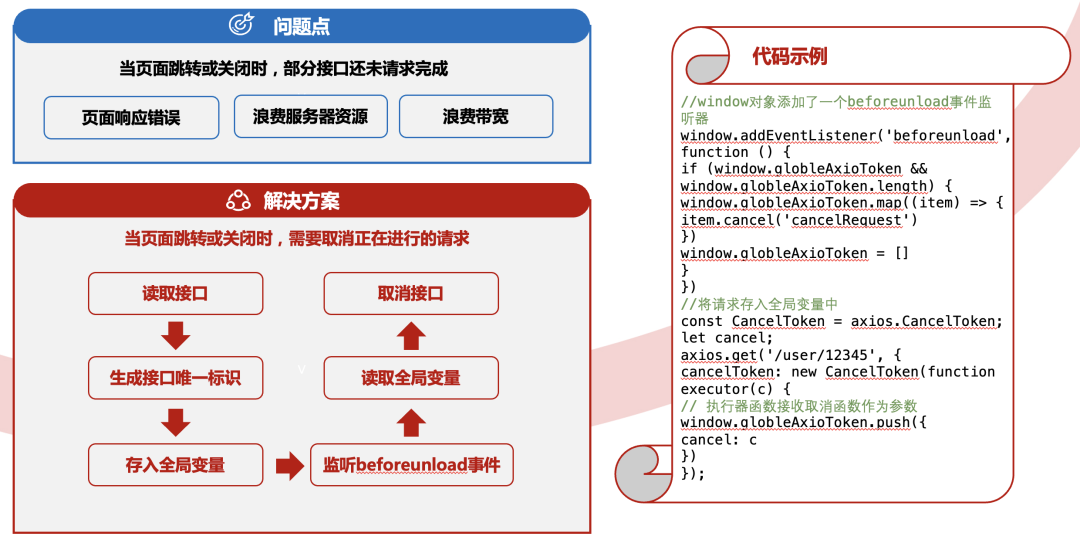 具体实现方案为读取接口时生成接口唯一标识,存入全局对象中。再在window对象添加了一个beforeunload事件监听器,当用户关闭或刷新页面时,会执行监听器中的回调函数。将之前存在全局变量window.globleAxioToken中的请求取消掉。