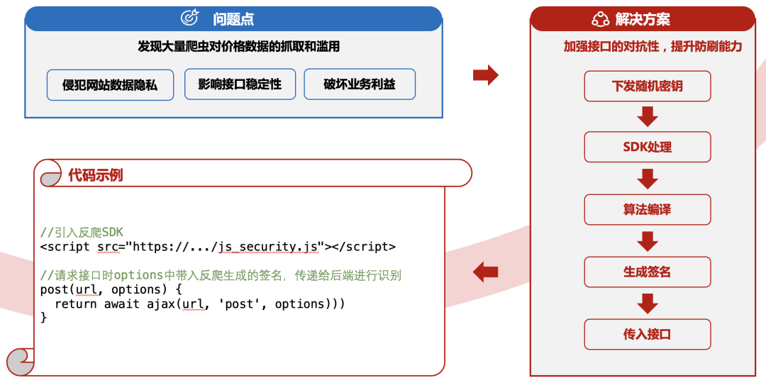 于是竞速榜网页价格信息接口添加网关和对应的SDK完成加密操作。主要通过后台下发的token和随机密钥算法,由前端将特定信息通过算法生成签名,传递给后端进行识别,可有效识别/拦截刷单刷券所产生的业务损失,加强接口的对抗性,提升防刷能力。