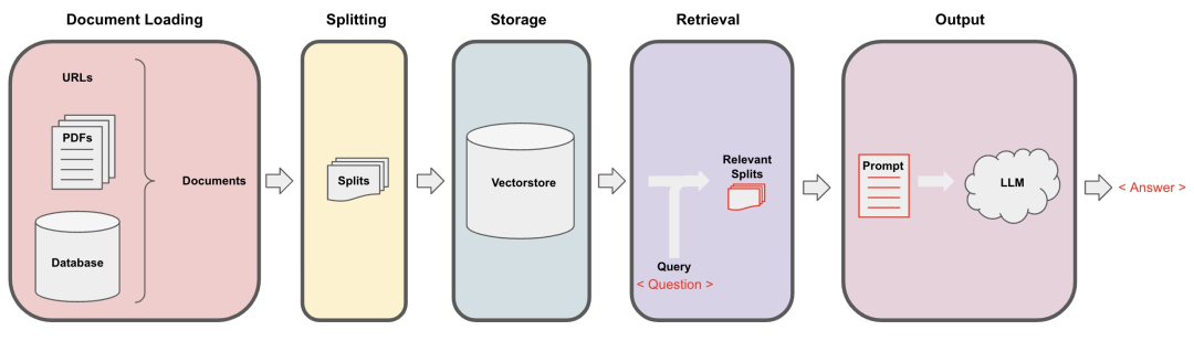 索引和外部数据进行集成,用于从外部数据获取答案。如下图所示,主要的步骤有