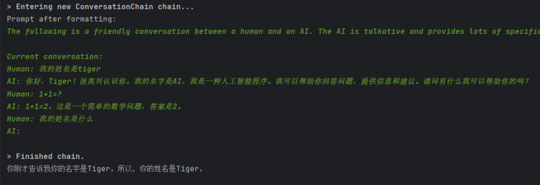 from langchain.chains import ConversationChainfrom langchain.memory import ConversationBufferMemoryfrom azure_chat_llm import llmmemory = ConversationBufferMemory()conversation = ConversationChain(llm=llm, memory=memory, verbose=True)print(conversation.prompt)print(conversation.predict(input="我的姓名是tiger"))print(conversation.predict(input="1+1=?"))print(conversation.predict(input="我的姓名是什么"))