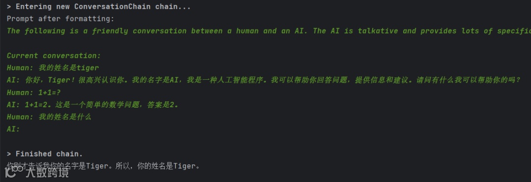 通过查看chain的prompt,可以发现{history}变量传递了从memory获取的会话上下文。下面的示例演示了Memory的使用方式,可以很明细看到,答案是从之前的问题里获取的。