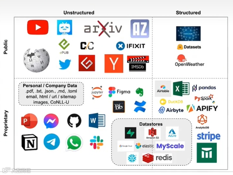 如下图所示:LangChain目前支持结构化、非结构化以及公开以及私有的各种数据